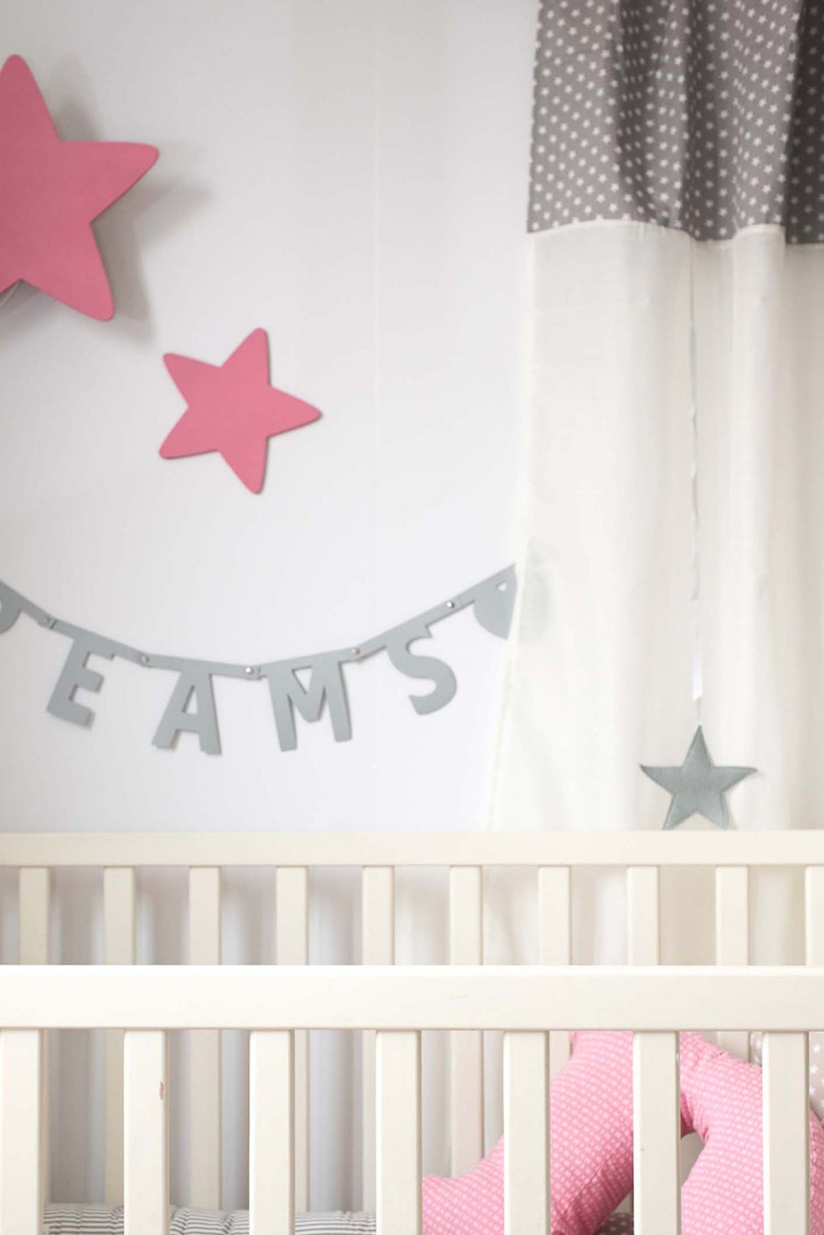 וילון מעוצב לחדר ילדים עם כוכבים או לבבות מלבד.